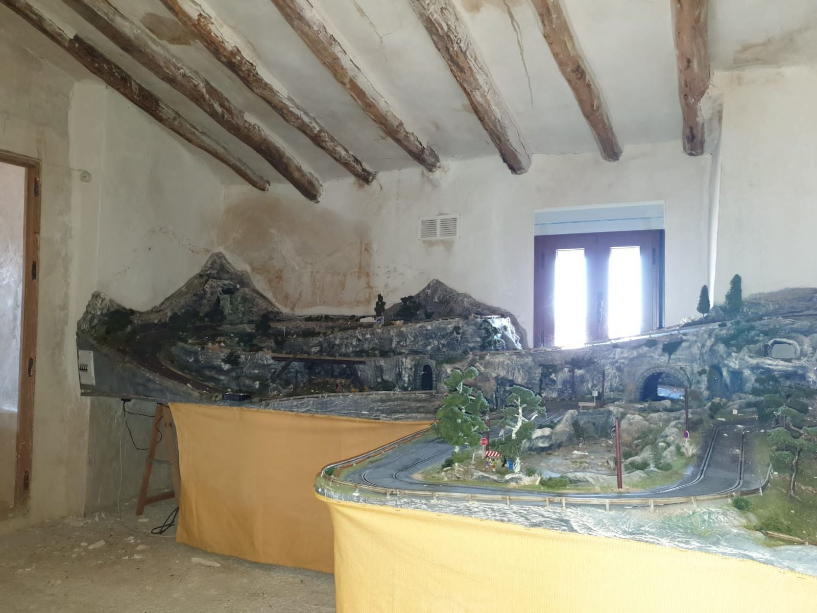 2 habitaciones con salita grande en la primera planta y 1 habitación normal,1 terraza solárium en la primera planta, 1 habitación contigua a la buhardilla que es la que esta en escalextric y la buhardilla,1 cochera independiente, Una zona frente a la casa con una mesa de mármol y otras estancias externas fuera de la casa que están en pie,(las paredes están bien se puede construir) pero están para reformar.